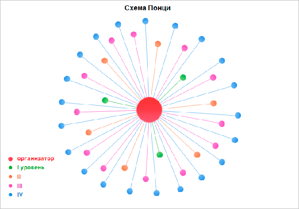 Одноуровневую часто называют по имени основателя. В центре круга организатор, который контролирует всех участников схемы. Доход первых вкладчиков образуется за счет вкладов последующих. Со временем число членов этой системы растет, растут и обязательства организатора по выплате процентов. Но неизбежно наступает момент, когда при росте обязательств число вкладчиков снижается или прекращается вовсе.