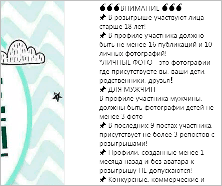 Совет: чтобы привлечь хотя бы небольшое количество реальных подписчиков, которые потом не захотят отписываться, четко опишите требования к участникам: пол, возраст, наличие аватара в профиле и определенного количества публикаций. Чем точнее зададите параметры, тем больше шансов на достижение цели. Пример на скриншоте.