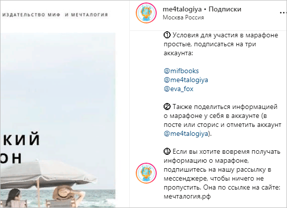По этой методике также можно проводить общие марафоны, прямые эфиры, тренинги и другие мероприятия, в том числе с розыгрышами призов и рассылками полезных материалов. Пример условий на скриншоте.