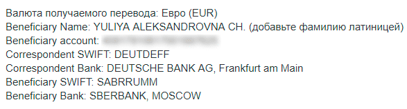 Еще раз акцентирую ваше внимание, что все поля должны заполняться английскими буквами (Ф. И. О., адрес, назначение платежа и т. д.).