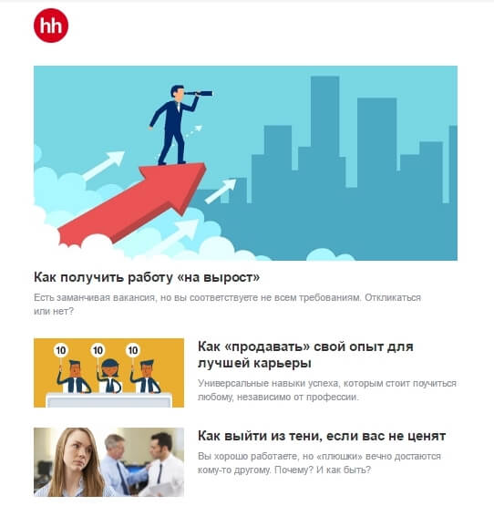 Компания HeadHunter использует e-mail-рассылку для повышения лояльности соискателей и присылает полезные советы по трудоустройству и построению карьеры.