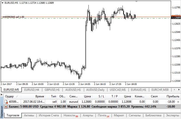 Стоп! Но ведь в терминале в графе «Свободная маржа» не 3 873.2, а 3 855.2 – почему? Потому что наша сделка висит в минусе – в графе «Прибыль» значение «-18.00».