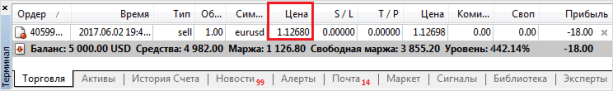 Мы успешно вошли в рынок, сделка отобразилась в окне «Терминал». Давайте теперь разбираться с деталями. В графе «Цена» видим значение 1.12680 – это стоимость одного евро, выраженная в долларах.