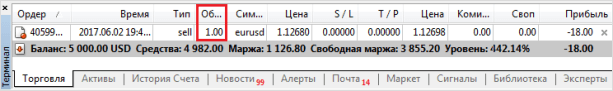 По нашей сделке показана «Прибыль» в размере «-18.00», баланс – «5 000 $». Прибавляем к балансу прибыль (а «Прибыль» у нас отрицательная, как видите), получаем 4 982 $ — «Средства». И именно из этих 4 982 $ мы должны вычесть свой залог (маржу), чтобы получить свободные средства (или свободную маржу, если быть более точным) в размере 3 855.2 $.