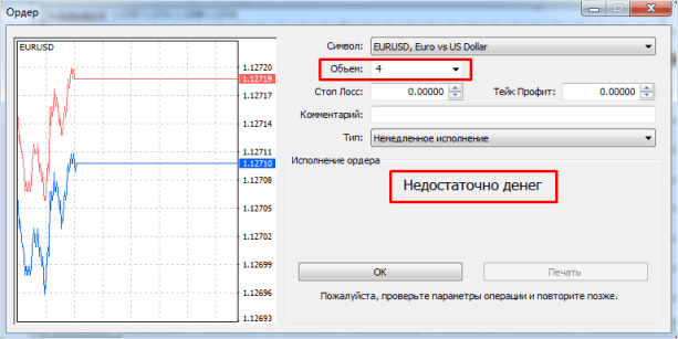 Попробуем открыть позицию объёмом 4 лота. Не хватает денежек.