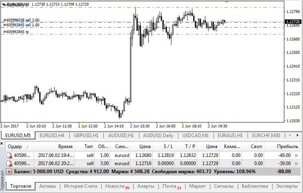Мы открыли ещё несколько сделок разными лотами. Уровень теперь – 99.48. Не можем открывать новые сделки даже минимальным лотом.