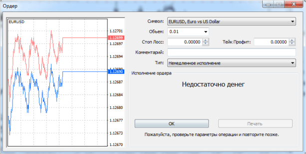 Сейчас евро стоит 1.12719, следовательно, цена целого лота – 112 719 долларов. Плечо 1:100, значит, моих денег требуется в сто раз меньше – 1 127.19 доллара. Нам нужно 4 лота, то есть ровно 4 508.76 доллара (1 127.19*4) – нету столько…