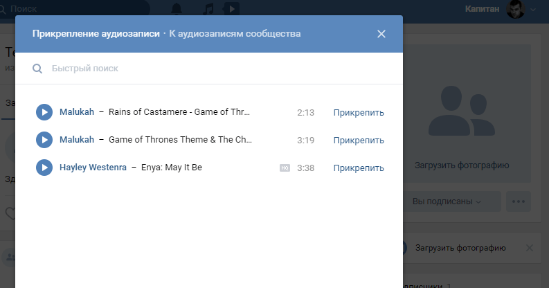 Откроется окно, в котором вы сможете выбрать аудиозаписи, которые хотите добавить. Учитывайте, что добавить к посту можно только те видеозаписи, которые уже загружены в раздел аудиозаписей вашего аккаунта.