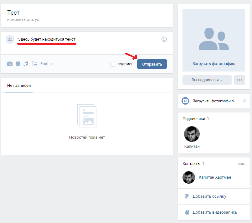 Отлично, с созданием заголовка разобрались. Теперь необходимо понять, как отправлять обычный текстовый пост. Опять же, чтобы сделать это, необходимо поставить курсор в поле «Что у Вас нового?». Всё что вы напишете в данном поле, станет текстом вашего поста: