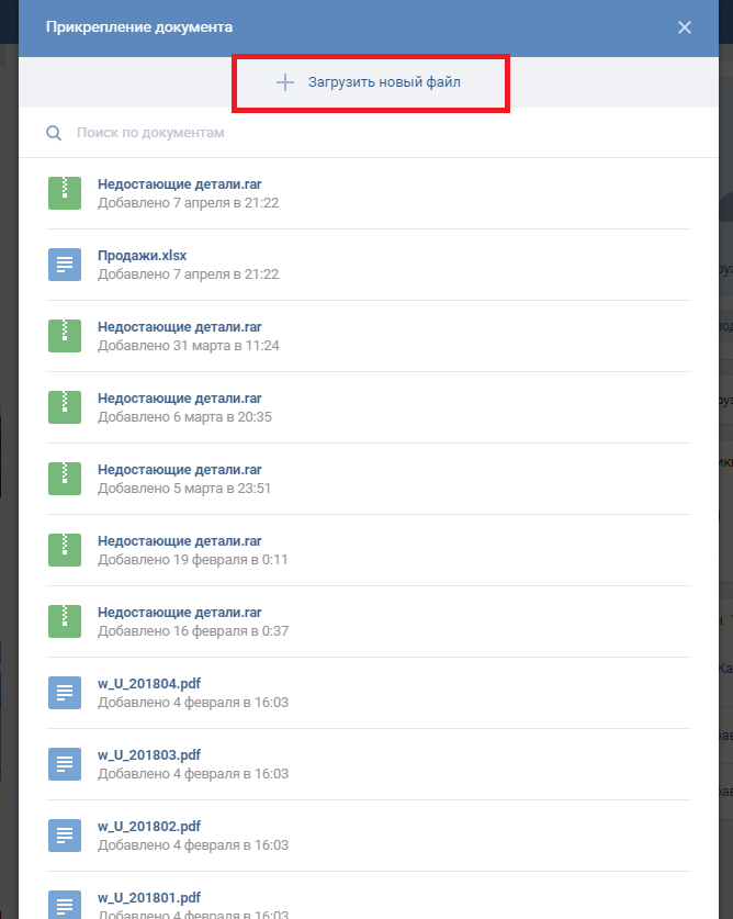 Здесь выбираем вкладку «Документ». Появится список ранее загружаемых вами документов. Здесь же вы можете загрузить новый документ, нажав на кнопку «Загрузить новый файл»: