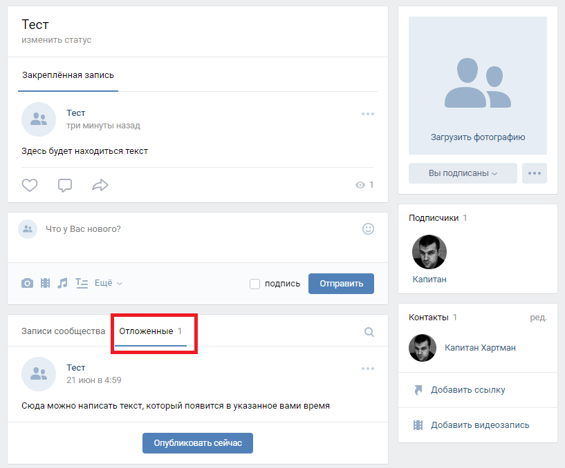 Обратите внимание, что пост находится во вкладке «Отложенные», где вы в любой момент времени сможете его досрочно опубликовать. Если не хотите каждый раз делать это вручную, то выберите подходящий сервис для автопостинга в ВК.