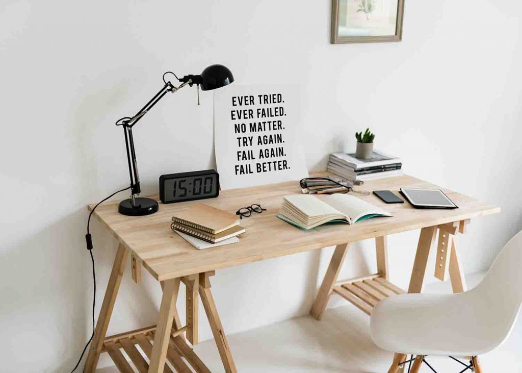 Мебель для офиса: стол из дерева с мобильным телефоном, лампой и планшетом.Привыкая, мы становимся предсказуемыми и не развиваемся.