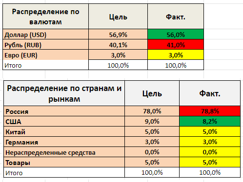 Покажу часть нашего семейного инвестиционного портфеля. К таблице учета активов у нас есть вот такие небольшие таблицы распределения по классам активов, уровню развития рынков, валютам и странам. По ним нам сразу видно, где нарушено первоначальное распределение: в большую сторону – красный цвет, в меньшую – зеленый, желтый цвет означает, что все нормально.