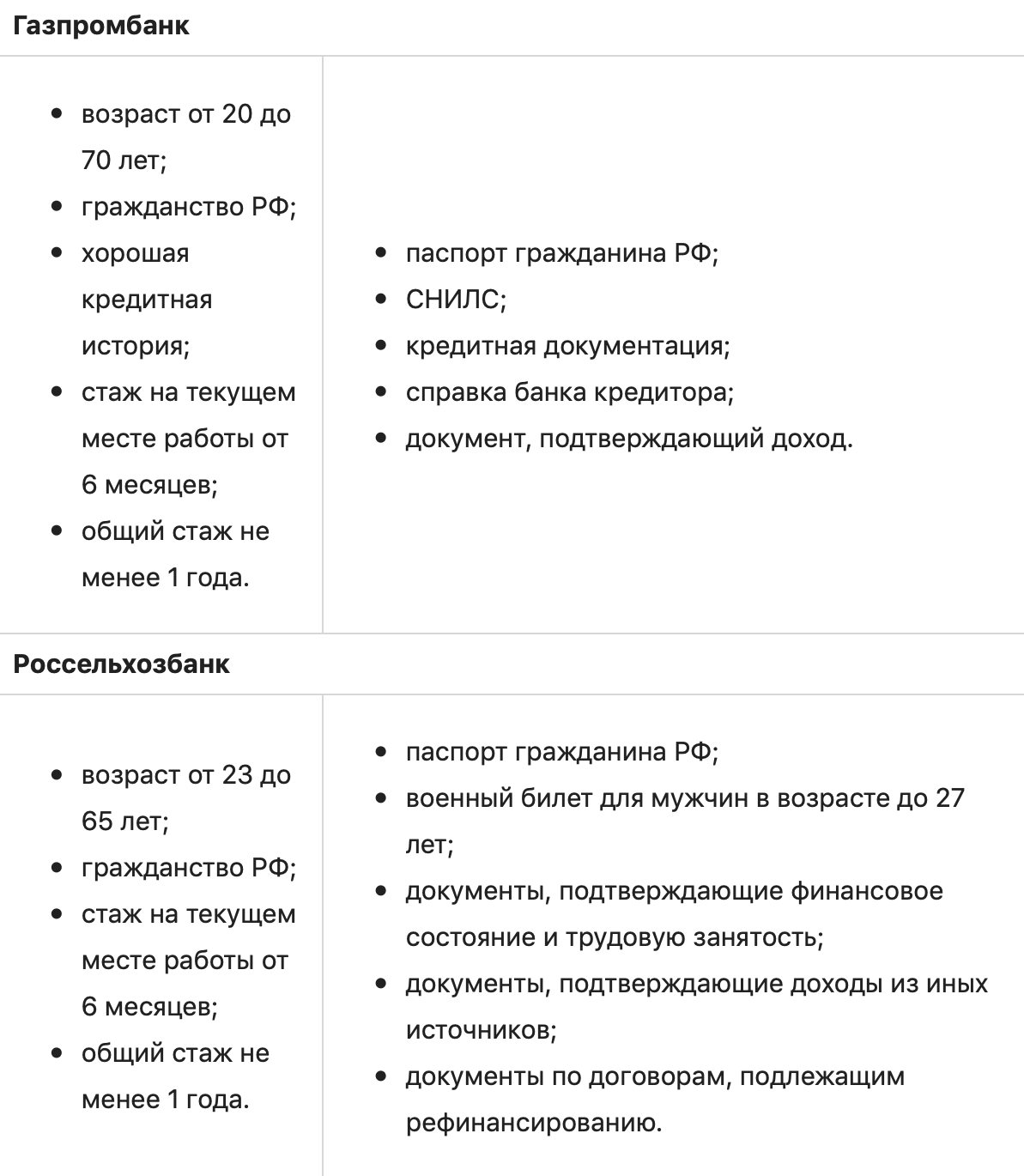 Требования к заемщику и пакет документов мало чем отличаются от получения простого потребительского кредита. В разных организациях они могут отличаться. Посмотрим на первые 5 банков по рейтингу финансового портала Банки.ру.