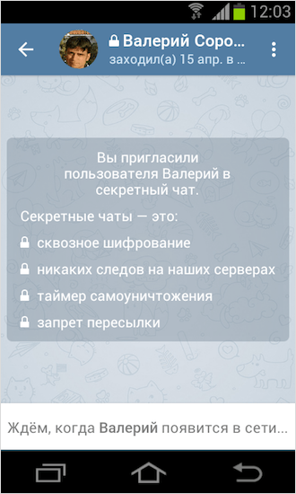 В обычном чате или группе (отличительные особенности которой мы разбирали в прошлой статье) информация с вашего устройства идёт на сервер, а оттуда синхронизируется с другими аккаунтами. Конечно всё происходит мгновенно, но существует теоретическая возможность взлома данных сервера, поэтому придумали обмен данными по типу клиент-клиент.