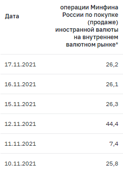 Каждый рабочий день на сайте ЦБ РФ публикуется информация об операциях Минфина по покупке/продаже иностранной валюты. Например, так выглядела денежная интервенция с 10 по 17 ноября 2021 г.