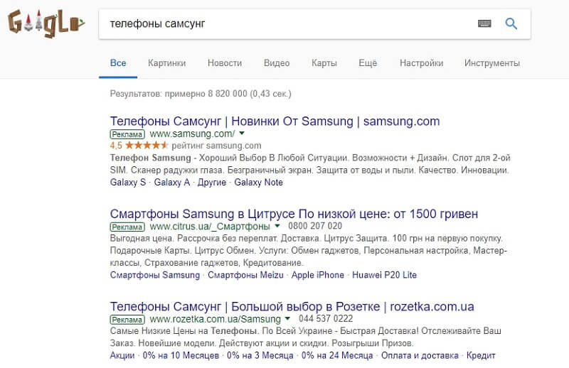 Пример контекстной рекламы – если пользователь интересуется покупкой телефона. Он ещё не знает, где купить и какую модель выбрать. Но у него уже есть варианты. Бренды рассказывают о себе: