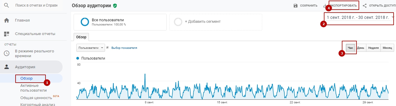 Первым делом нужно собрать исходные данные. Их будем брать из Google Analytics. Нужно перейти в раздел Аудитория / Обзор, указать период сбора в одну неделю (как минимум), установить почасовую детализацию. Жмем «Экспортировать» и скачиваем XLSX-файл.