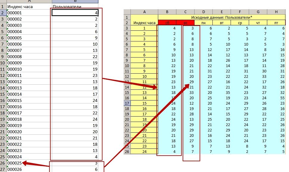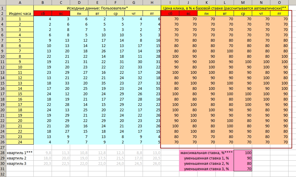 Каждая строчка в полученном файле — один час. Эти данные теперь нам нужно подставить в шаблон, который автоматически рассчитает корректировку ставок.