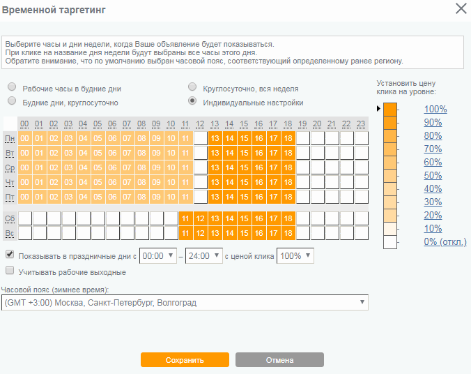 Конверсия рекламной кампании может быть разной в зависимости от дня недели и времени суток. Для того, чтобы кампания работала максимально эффективно, нужно настраивать график показа и корректировки ставок. Если крутить объявления по максимальной ставке круглосуточно, то вы перерасходуете бюджет. Если наоборот, неправильно настроите время показа, можете упустить часть «теплого» трафика.