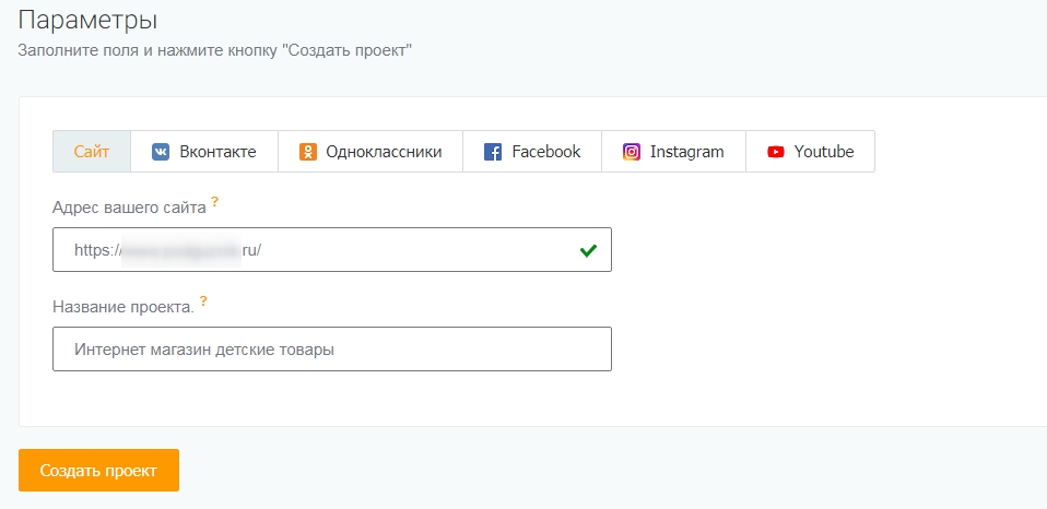 Добавьте URL вашей площадки. Обратите внимание, в системе кроме сайтов также можно рекламировать группы в соцсетях, Инстаграм-аккаунты или каналы на YouTube. В нашем примере мы продвигаем сайт, поэтому указываем адрес сайта и название проекта.