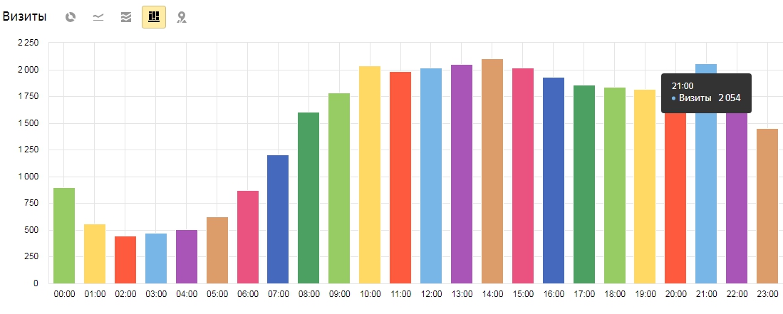 Данные о почасовой активности можно посмотреть в Яндекс.Метрике. В интерфейсе Метрики это отчет «Посещаемость по времени суток».