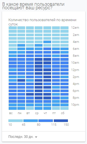 В Google Analytics есть виджет, который наглядно показывает, как распределяется активность посетителей вашего сайта на протяжении недели: