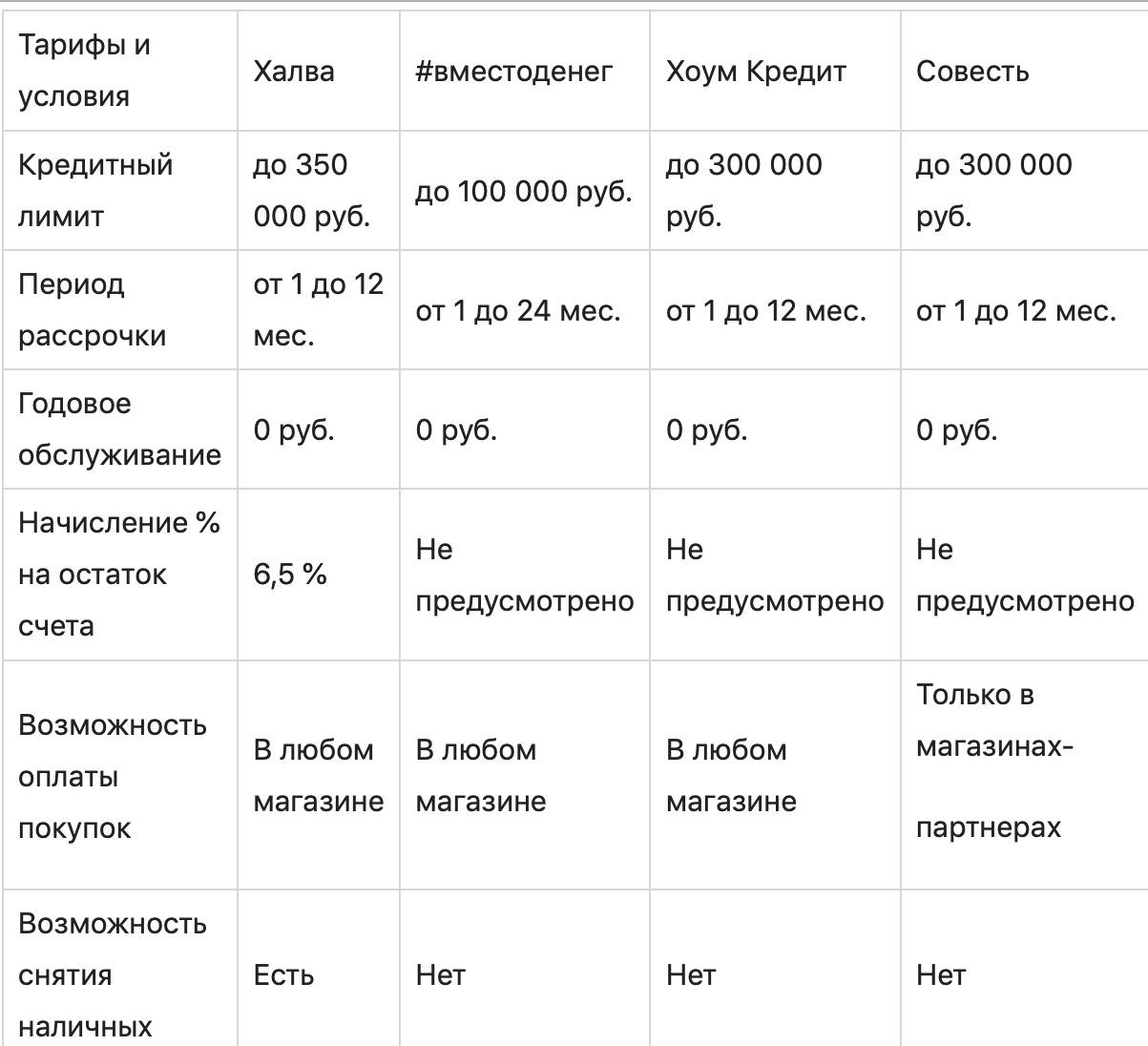Кроме рассмотренной нами карты Халва от Совкомбанка, на рынке банковских карт обращаются и другие: #вместоденег от Альфа-Банка, карта рассрочки от Home Credit Bank, Совесть от Киви Банка.
