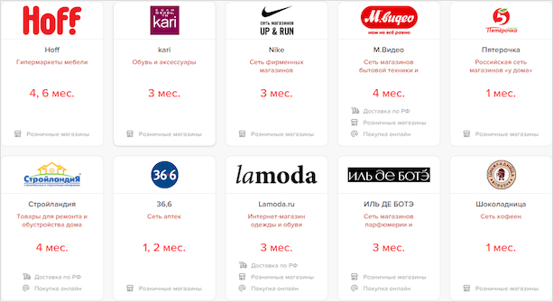 В карточке самого магазина удобно ориентироваться по сроку рассрочки и по возможности покупки онлайн.