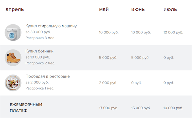 А теперь сам механизм работы. В течение месяца вы расплачиваетесь картой за покупки, совершенные как в офлайн-, так и в онлайн-магазинах. Сумма каждой покупки делится на период рассрочки, предоставленный конкретным магазином. По итогам месяца формируется общий платеж, который необходимо погасить в установленный период.