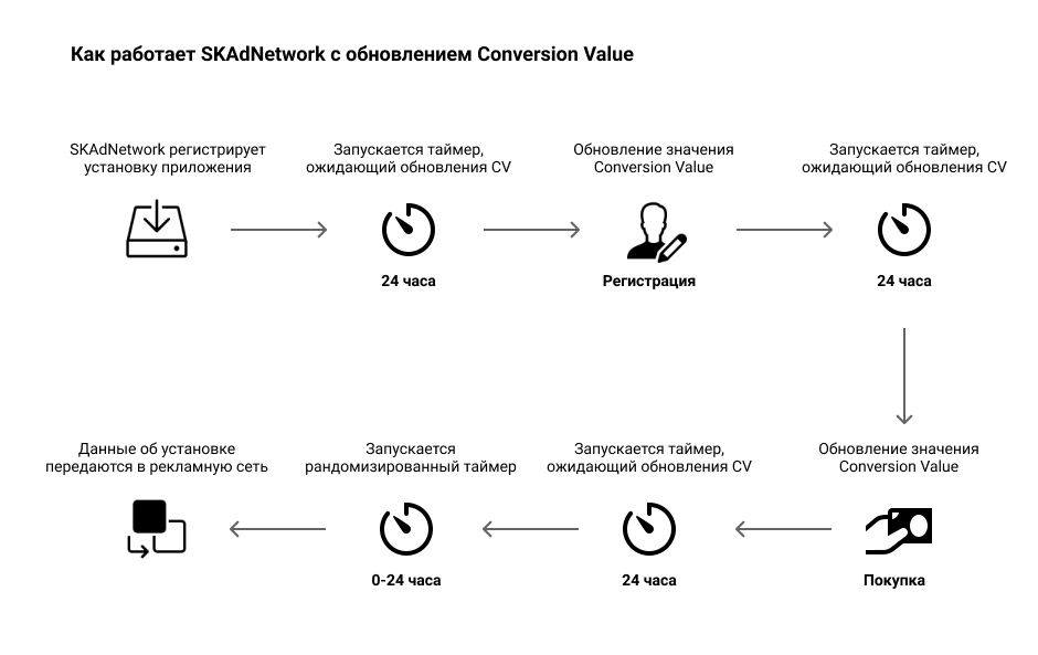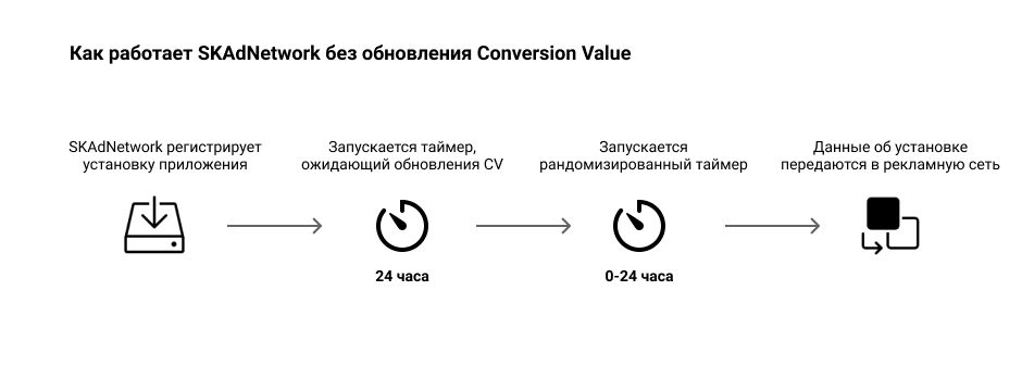 Одна из главных особенностей SKAdNetwork – данные передаются в рекламную систему не в режиме реального времени, а с задержкой. Это нужно для того, чтобы рекламная система не могла знать точное время установки приложения (еще один уровень защиты приватности пользователей). Задержка реализована с помощью 24-часовых таймеров, которые перезапускаются при обновлении значения CV.