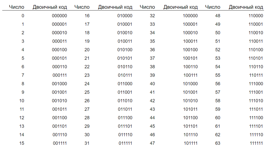 Вот так выглядят все числа в диапазоне с их двоичными кодами:
