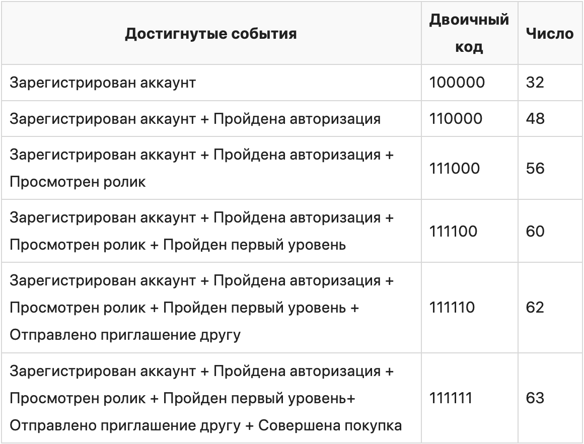 Напомним, Apple использует для значения Conversion Value числа от 0 до 63, потому что именно такой диапазон чисел помещается в 6 бит информации. А 6 бит, в свою очередь, это шесть значений 0 или 1, которые в двоичной системе позволяют закодировать число от 0 до 63.
