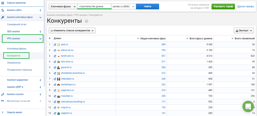 Возьмём тематику строительства домов, как одну из самых конкурентных, где дешёвые клики будуте очень востребованы. Для этого в сервисе Serpstat заходим в PPC-анализ и далее анализ ключевых фраз. Сначала смотрим выдачу Яндекса по ключевому запросу «строительство домов» — регион Москва.