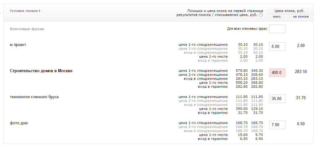Получается, чтобы попасть в гарантированные показы по конкурентному запросу, нам нужно заплатить 282 рубля, а клик по тем запросам, которые мы отобрали начинается от 2 рублей. И таких запросов можно выявить очень много.