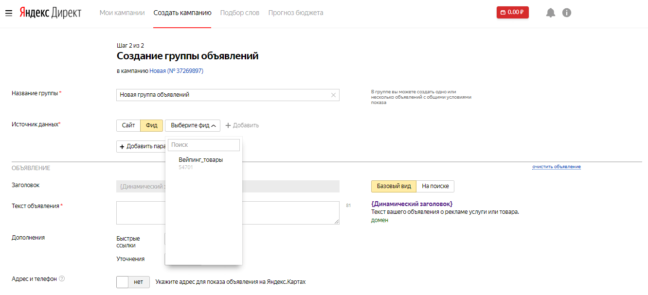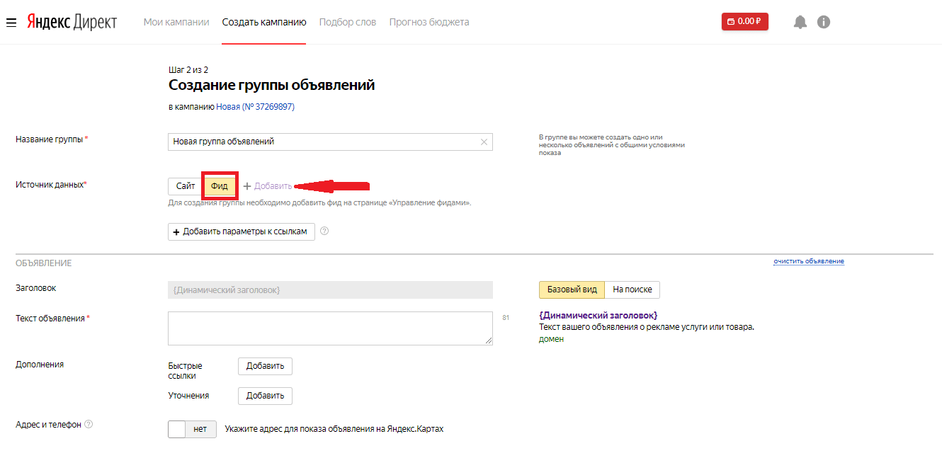 Чтобы настроить такие объявления, необходимо указать источник данных — «Фид» — в настройках группы объявлений и кликнуть по ссылке «+Добавить».