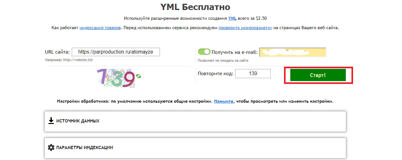 MySitemapGenerator поможет создать фид в несколько кликов. Чтобы сгенерировать файл с данными, необходимо зайти на сайт сервиса и кликнуть по кнопке «Создать YML бесплатно». В открывшемся окне необходимо вбить URL сайта, указать контактный email, на который сервис вышлет ссылку для скачивания файла, ввести проверочный код и кликнуть по кнопке «Старт».