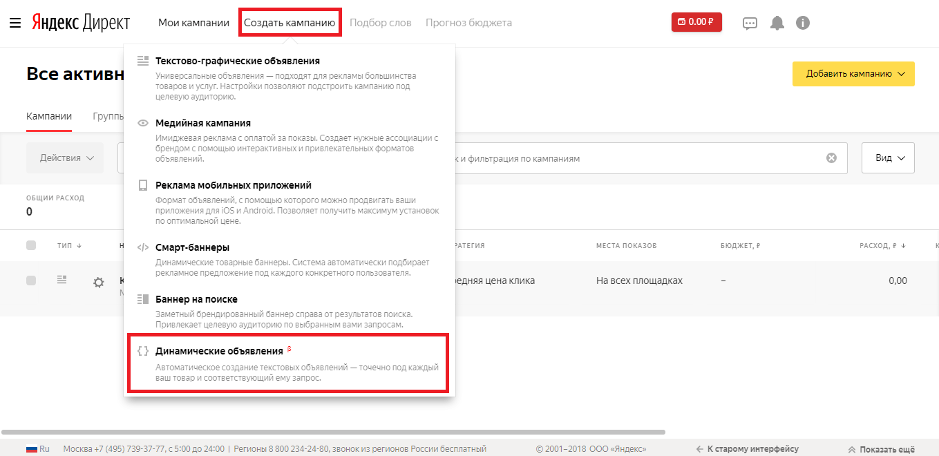 Чтобы создать динамические объявления такого типа, необходимо авторизоваться в сервисе Яндекс.Директ, кликнуть по разделу «Создать кампанию», выбрать пункт «Динамические объявления» во всплывающем списке.