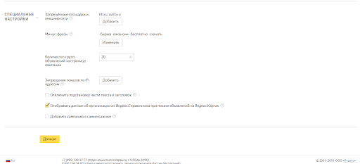 В разделе «Специальные настройки» вы можете добавить минус-фразы, ограничить показ объявлений во внешних сетях и на площадках РСЯ, запретить показ рекламы для определённых IP-адресов.