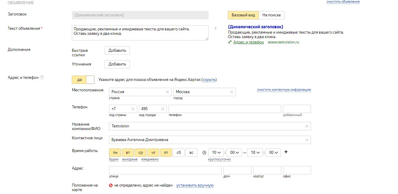 Для новой группы объявлений нужно указать название, домен сайта, придумать универсальный текст. Промо-материалы можно дополнить контактными данными — адресом и телефоном компании, быстрыми ссылками. Их нужно вбить в отдельном блоке «Адрес и телефон». Заголовок, URL страницы перехода, отображаемые ссылки и ключевые фразы сервис сгенерирует автоматически.