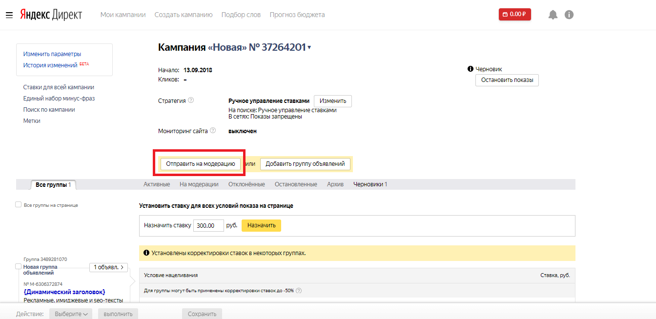 После клика по кнопке «Сохранить» сервис перенаправит вас на страницу созданной рекламной кампании. Здесь вы сможете изменить настройки — поменять стратегию показов, назначить ставки, — добавить новую группу объявлений или отправить их на модерацию.