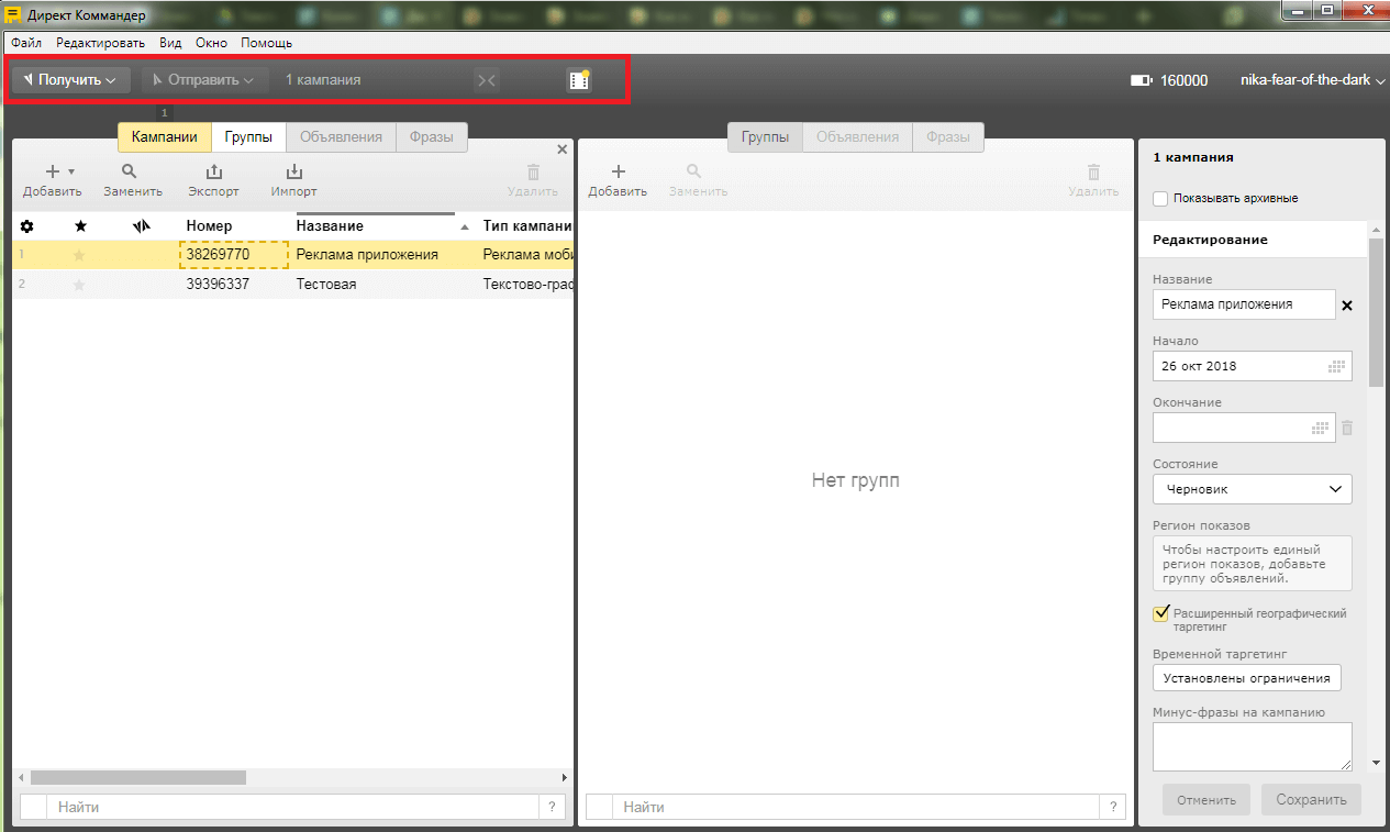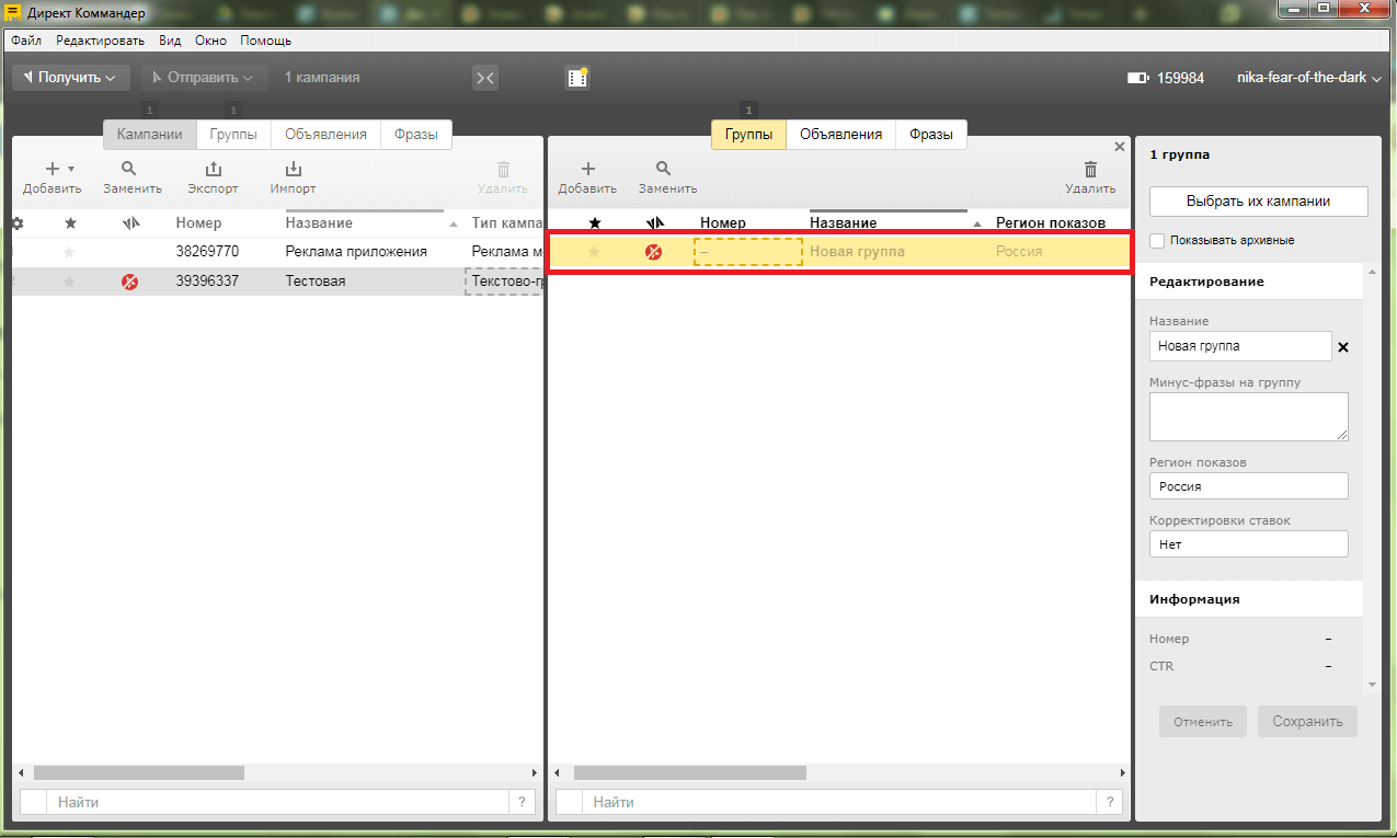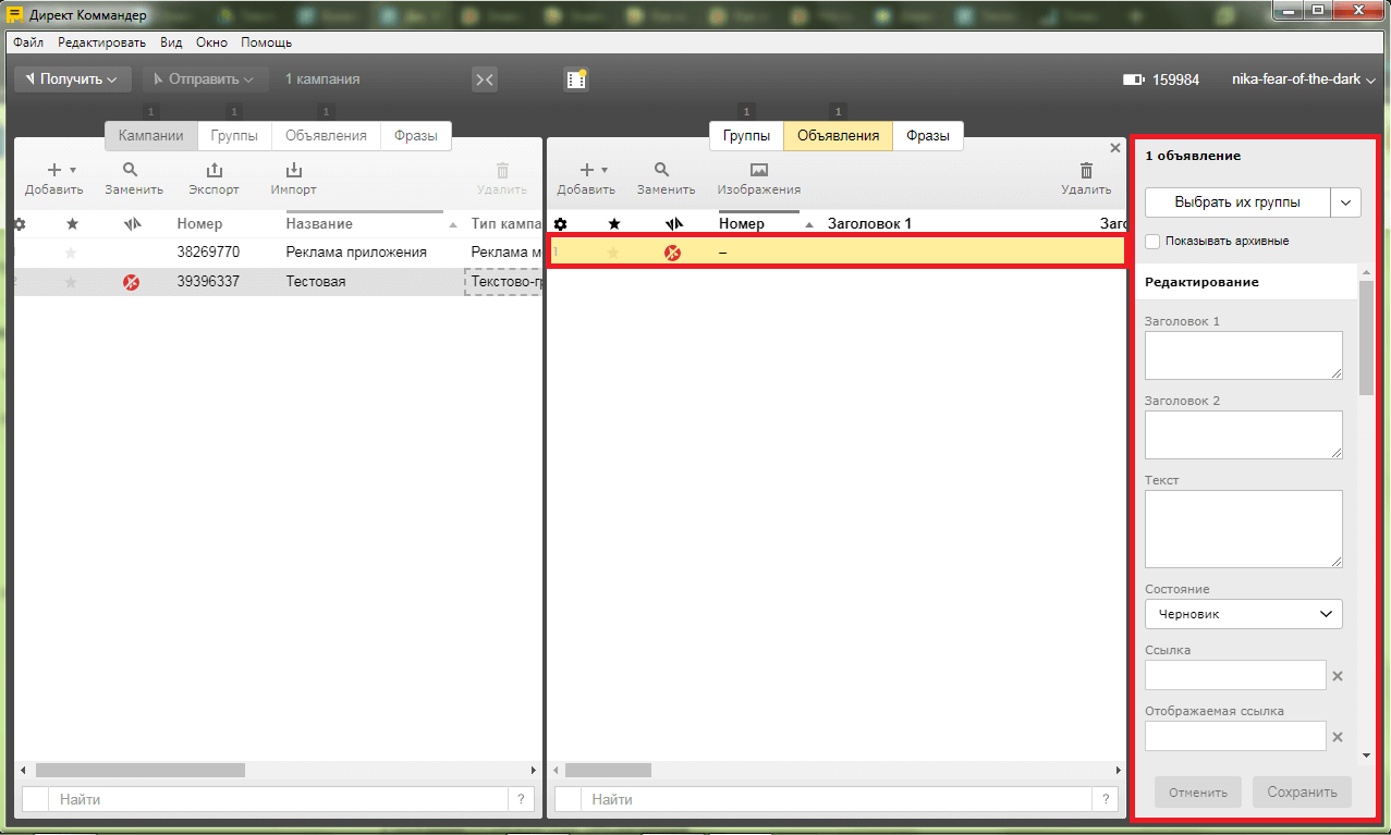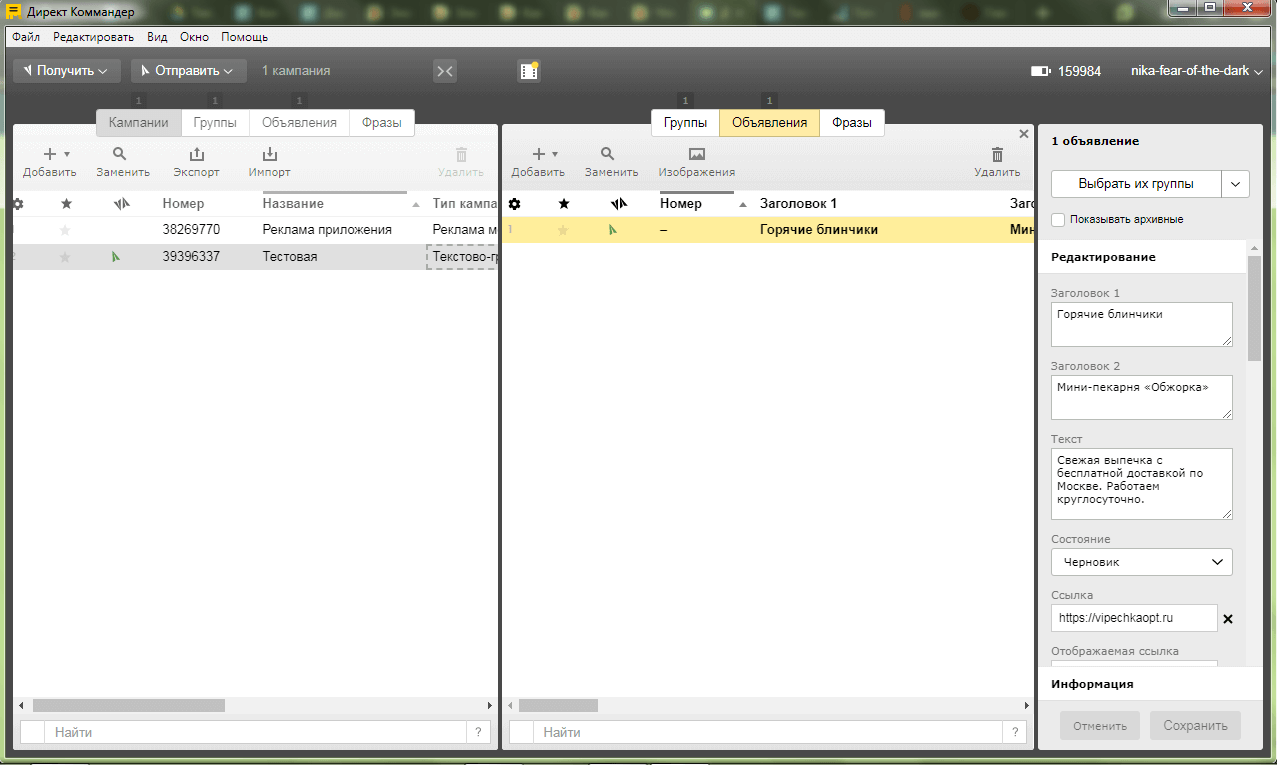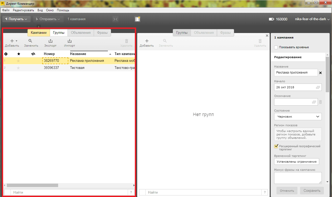 Давайте теперь детально разбираться, как работать с рекламными кампаниями в Директ Коммандер.