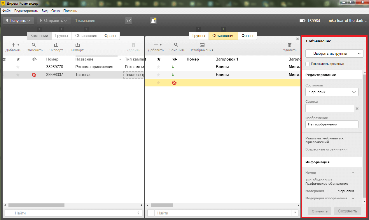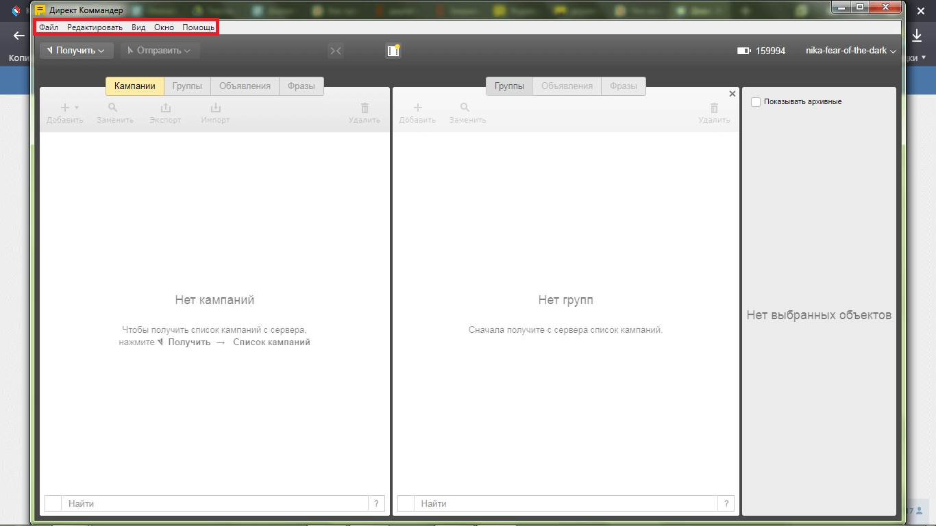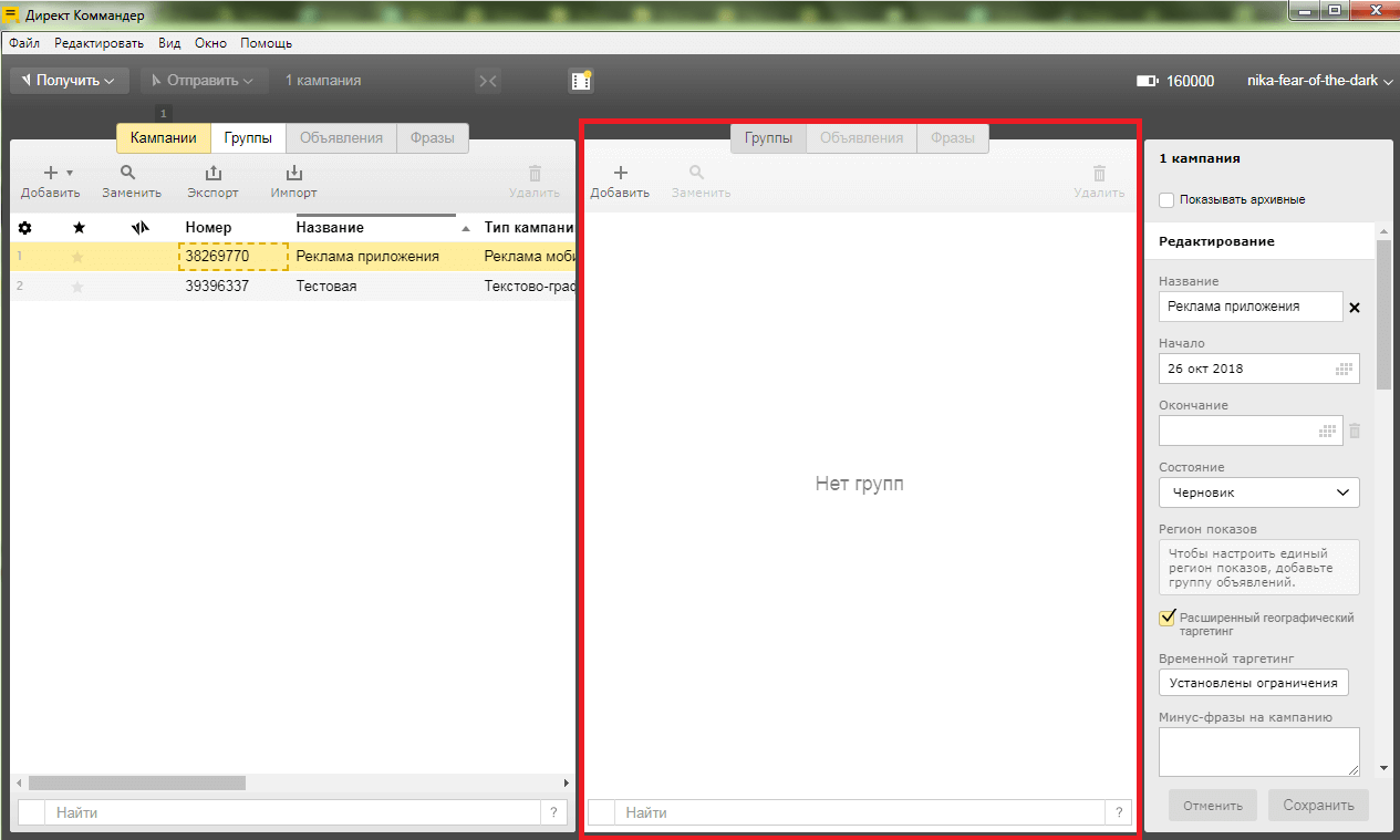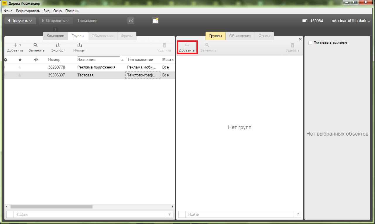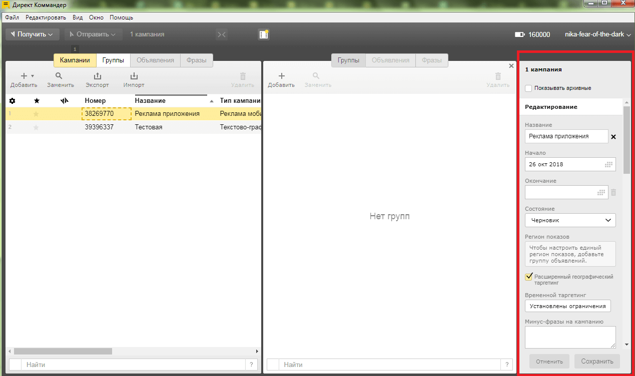Давайте теперь детально разбираться, как работать с рекламными кампаниями в Директ Коммандер.