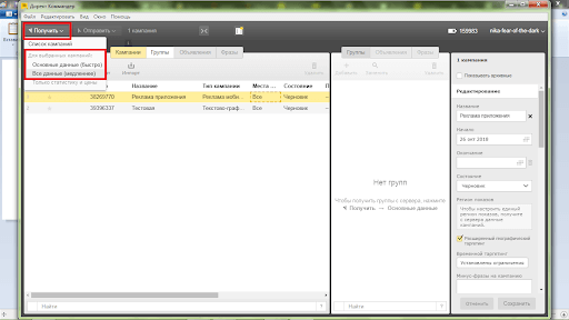 Для загруженных в Директ Коммамндер кампаний вы можете подгрузить краткую или развёрнутую статистику — информацию о кликах, CTR, расходах и т. д. Кликните по интересующей РК в списке, нажмите снова на кнопку «Получить» и выберите «Основные данные» или «Все данные».