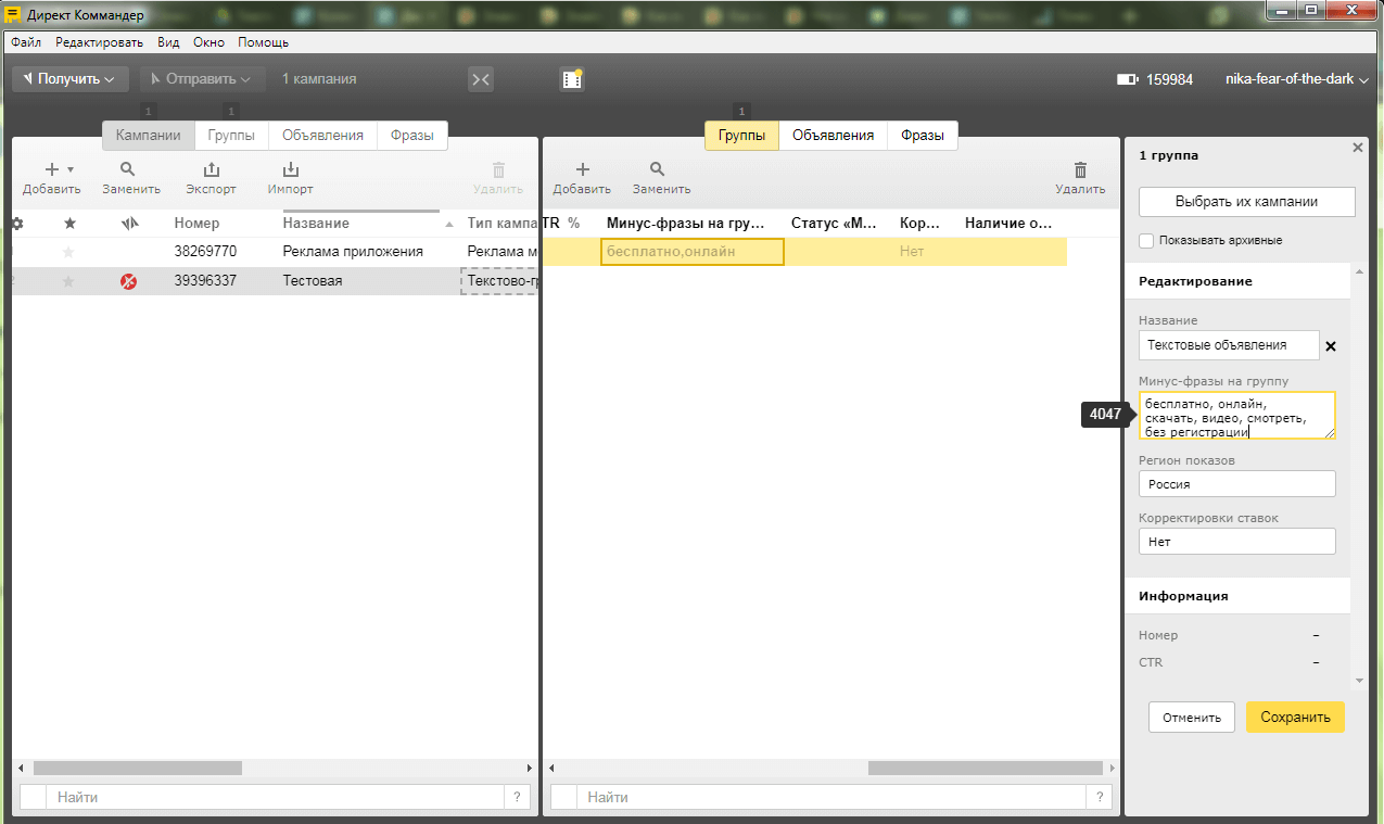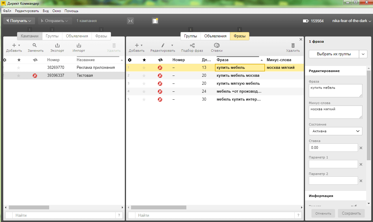 - быстро находить конкретные ключевые фразы из разных РК и групп объявлений;
