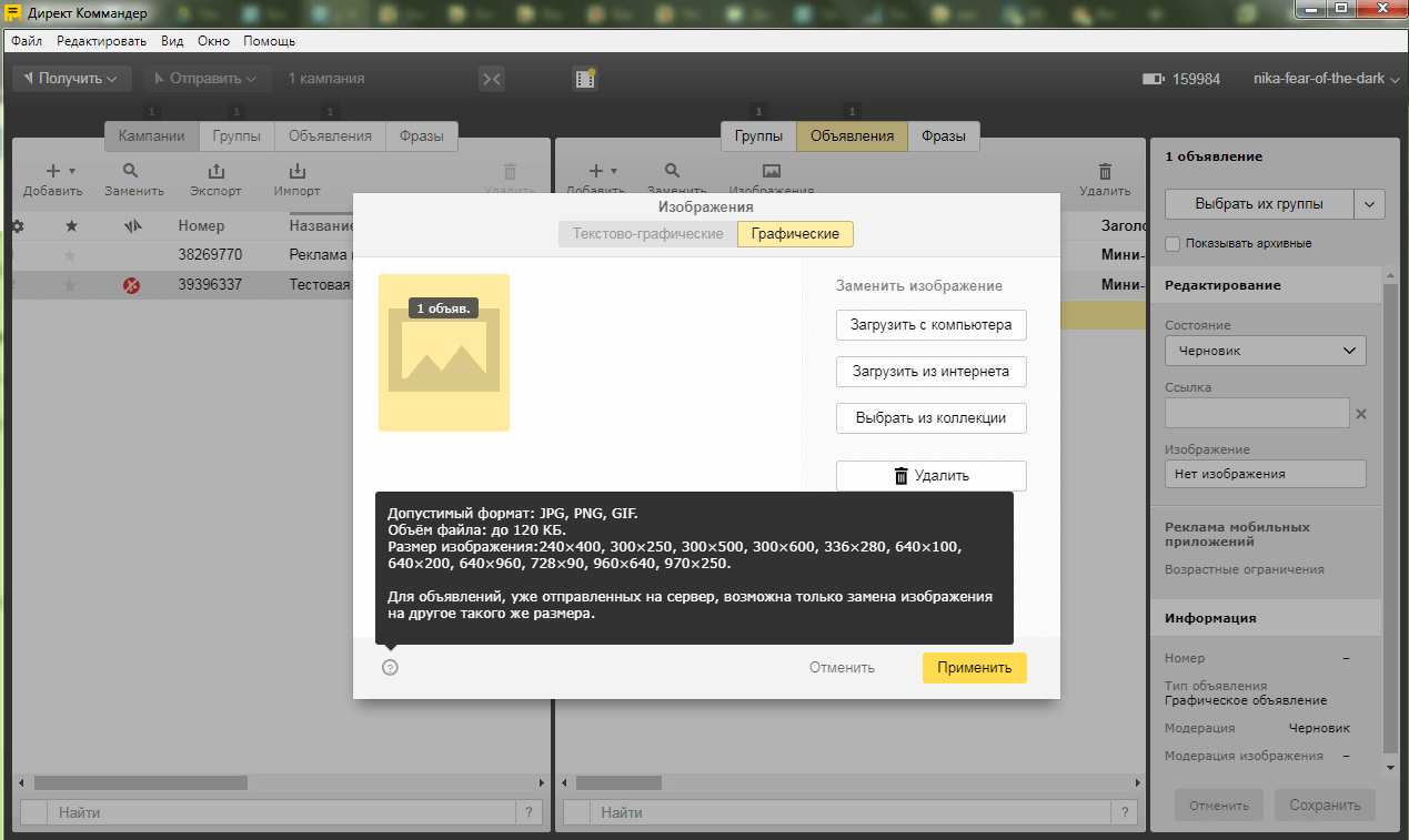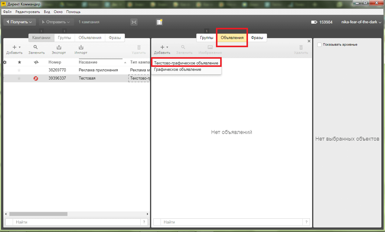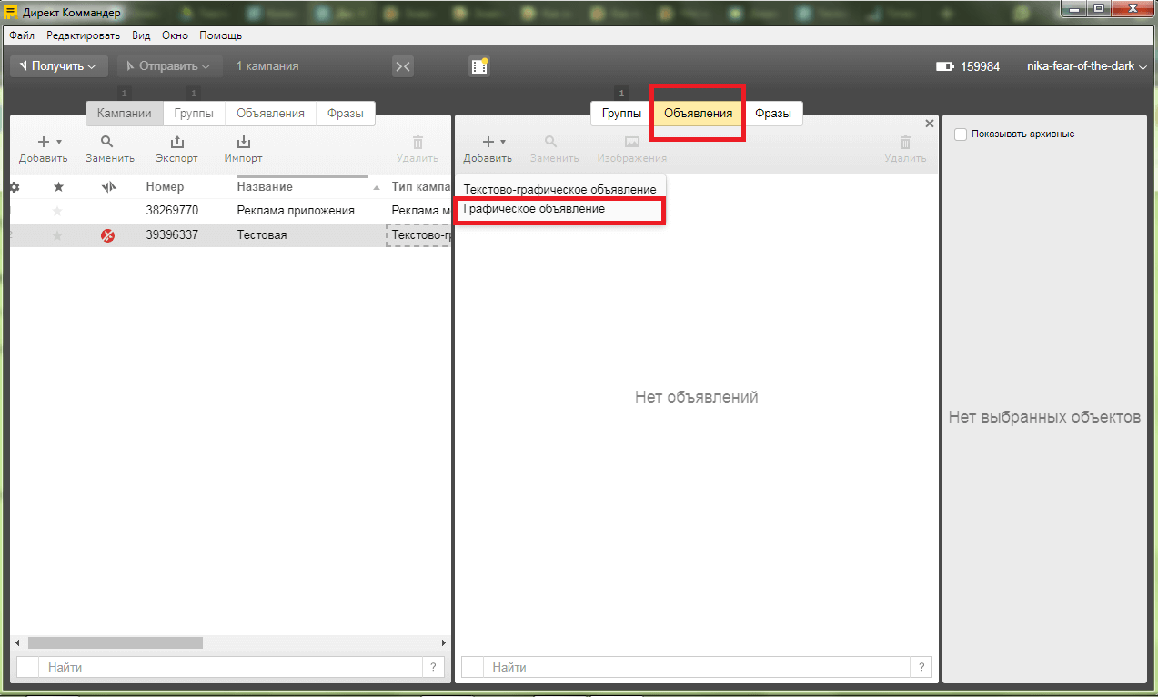 Чтобы добавить новое текстовое объявление, переключитесь на вкладку «Объявления» в дополнительной, центральной, панели и нажмите на «Добавить». Во всплывающем меню выберите пункт «Текстово-графическое объявление».