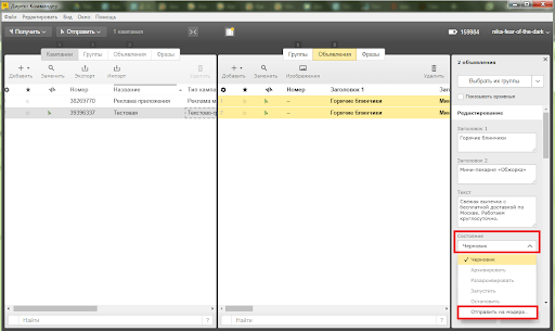 Несколько объявлений можно отправить на модерацию одним кликом. Чтобы сделать это одновременно, выберите их в списке, удерживая кнопку Ctrl, а если вам нужно выделить сразу все объявления, нажмите Ctrl + A, а затем измените настройки в разделе «Состояние».