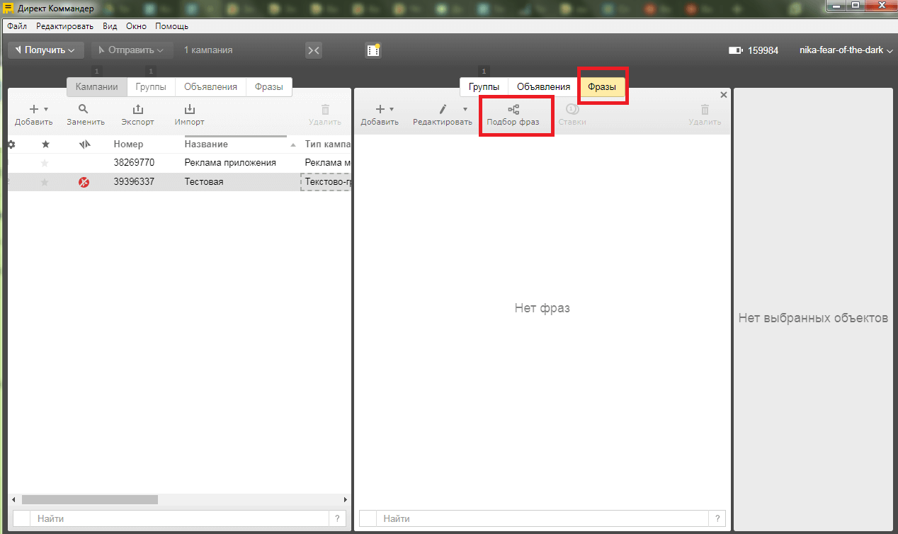 Чтобы подобрать фразы для объявлений и групп, перейдите во вкладку «Фразы» в дополнительной панели Директ Коммандера, а затем кликните по разделу «Подбор фраз».