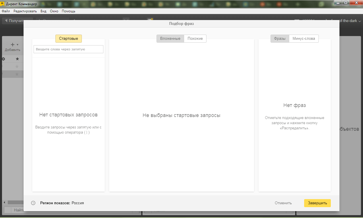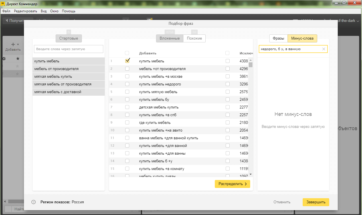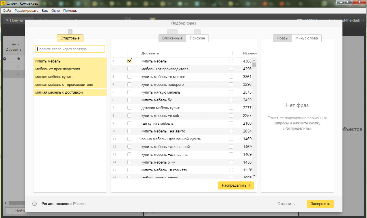 Чтобы распределить слова по объявлениям, нажмите в центральном столбце на раздел «Вложенные», отметьте подходящие ключевые фразы в списке и нажмите на кнопку «Распределить», а затем на «Завершить». Окно с подбором фраз закроется, и вы увидите основное меню Директ Коммандера. На дополнительной, центральной, панели отобразятся объявления под каждую подобранную вами ключевую фразу с учётом минус-слов.
