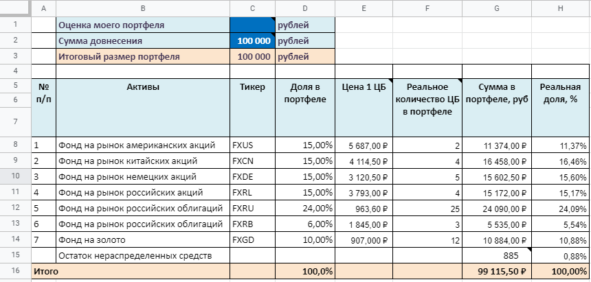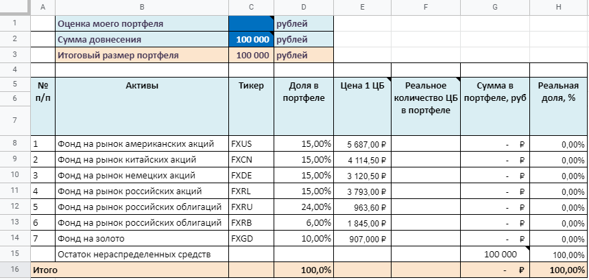 - Распределяем наши 100 000 руб. по активам таким образом, чтобы примерно соблюсти доли. Для этого заполняем колонку “Реальное количество ЦБ в портфеле”.